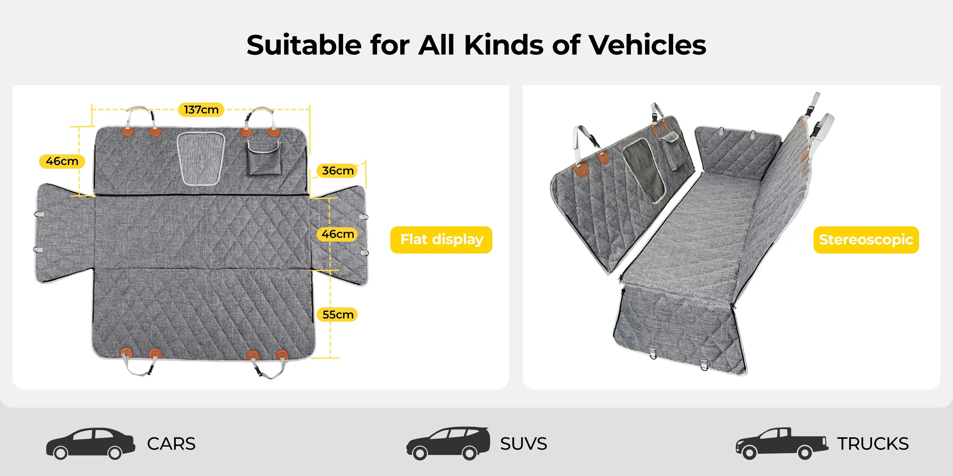 🐕 Universal Fit – Designed to fit most cars, SUVs, and trucks, with extended side flaps for full coverage. Reinforced stitching and quality zips ensure long-lasting performance.